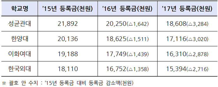 ▸15% 인하 :성균관대(3,284천원), 한양대(3,020천원), 경희대(2,997천원), 아주대(2,993천원), 중앙대(2,903천원), 이화여대(2,878천원), 인하대(2,872천원), 영남대(2,837천원), 서강대(2,753천원), 한국외대(2,716천원) ▸11.6% 인하 :건국대(1,970천원) | ||