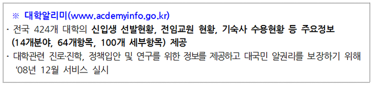 교육부는 앞으로도 학생들의 진로·진학에 필요한 정보를 제공할 수 있도록 ‘대학알리미’를 개선하고, 정부 3.0 핵심가치(개방·공유·소통·협력)에 따라 학생·교원·학부모의 편익을 확대해 나가겠다고 밝혔습니다.