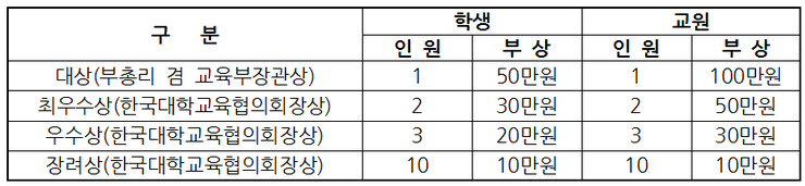 공모전에 접수된 수기는 주제 적합성, 대학 공시정보 및 관련 정보의 활용 여부, 내용의 현실성 및 표현력 등에 초점을 두어 심사하고, 수상자에게 다음과 같이 상장과 상금을 수여합니다.