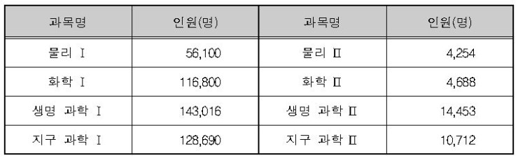 <표Ⅰ-4> 과학탐구 영역 과목별 응시자 현황