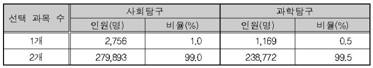 <표Ⅰ-7> 탐구 영역별 선택 과목 수에 따른 응시자 현황