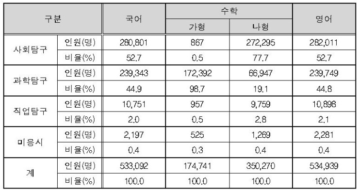 국어 영역의 경우 사회탐구 영역 응시자 비율이 52.7%, 과학탐구 영역 응시자 비율이 44.9%이었습니다. 수학 영역의 경우 가형은 사회탐구 영역 응시자 비율이 0.5%, 과학탐구 영역 응시자 비율이 98.7%이었습니다. 나형은 사회탐구 영역 응시자 비율이 77.7%, 과학탐구 영역 응시자 비율이 19.1%이었습니다. 영어 영역의 경우 사회탐구 영역 응시자 비율이 52.7%, 과학탐구 영역 응시자 비율이 44.8%이었습니다.