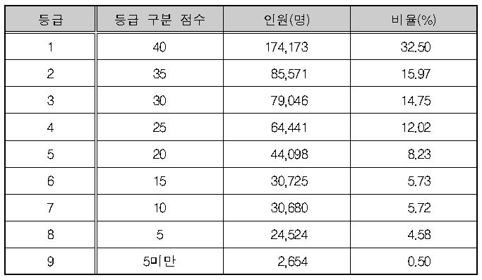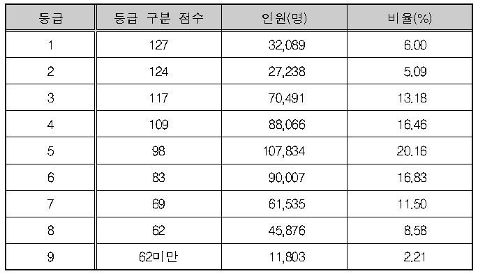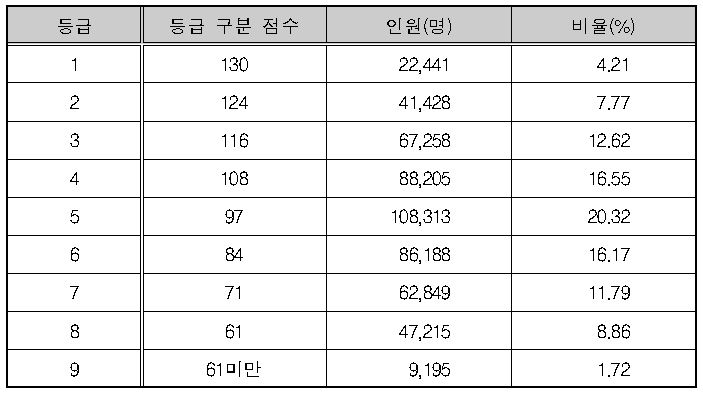 <표Ⅱ-3> 영어 영역 등급 구분 표준점수, 등급별 인원 및 비율