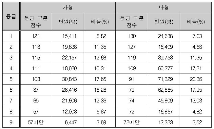 수학 영역의 등급 구분 표준점수와 등급별 인원 및 비율은 <표Ⅱ-2>와 같습니다. 1등급과 2등급을 구분하는 등급 구분 표준점수는 가형 121점, 나형 130점으로 나타났다습니.