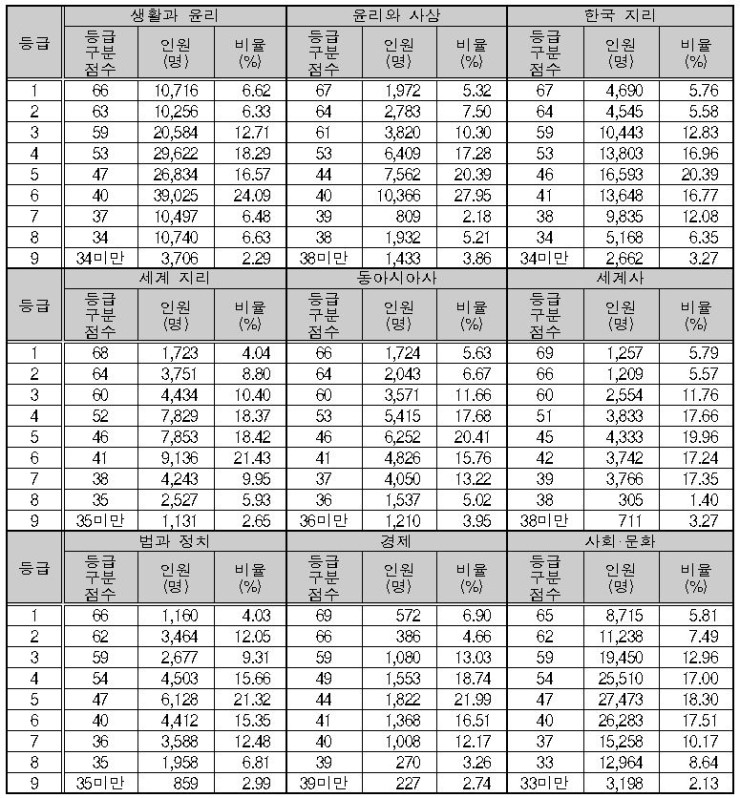 사회탐구 영역의 경우 과목에 따라 65점~69점으로 나타났습니다.