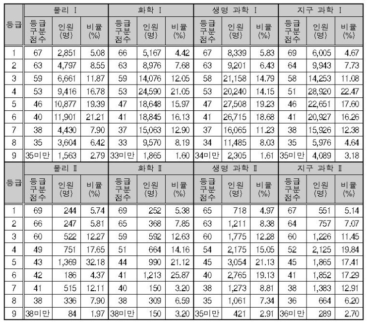 과학탐구 영역의 경우 과목에 따라 65점~69점으로 나타났습니다.