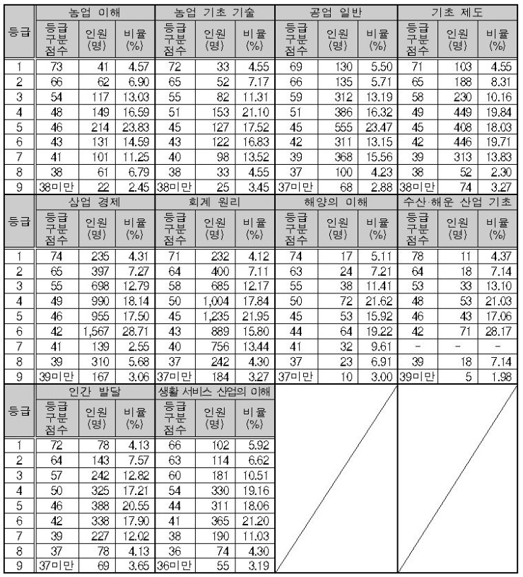 직업탐구 영역의 과목별 등급 구분 표준점수와 등급별 인원 및 비율은 <표Ⅱ-7>과 같습니다. 1등급과 2등급을 구분하는 등급 구분 표준점수는 농업 이해 73점, 농업 기초 기술 72점, 공업 일반 69점, 기초 제도 71점, 상업 경제 74점, 회계 원리 71점, 해양의 이해 74점, 수산‧해운 산업 기초 78점, 인간 발달 72점, 생활 서비스 산업의 이해 66점으로 나타났습니다.