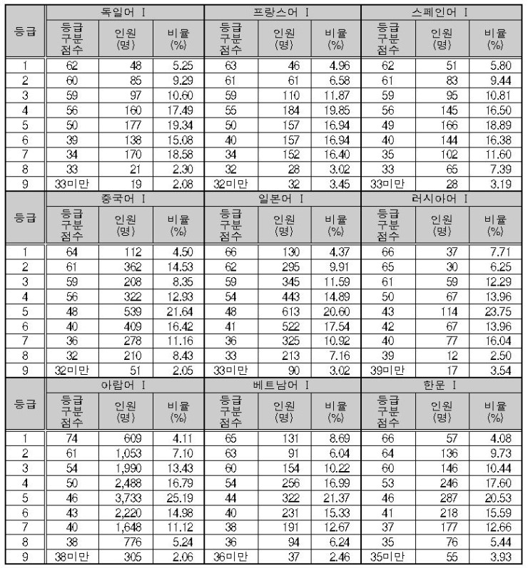 제2외국어/한문 영역의 과목별 등급 구분 표준점수와 등급별 인원 및 비율은 <표Ⅱ-8>과 같습니다. 1등급과 2등급을 구분하는 등급 구분 표준점수는 독일어Ⅰ 62점, 프랑스어Ⅰ 63점, 스페인어Ⅰ 62점, 중국어Ⅰ 64점, 일본어Ⅰ 66점, 러시아어Ⅰ 66점, 아랍어Ⅰ 74점, 베트남어Ⅰ 65점, 한문Ⅰ 66점으로 나타났습니다.
