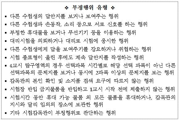 시험 종료 후 답안지를 작성하거나, 4교시 탐구영역을 응시할 때 시간별로 해당 선택과목이 아닌 다른 과목의 문제지를 보거나 동시에 2과목 이상의 문제지를 보는 행위까지 포함됩니다.