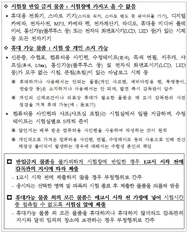3. 시험장 반입 금지 물품과 휴대가능 물품의 사전 고지