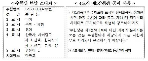 책상스티커에 4교시 선택과목을 기재하여 수험생들이 확인할 수 있도록 하고, 방송은 물론 감독관이 시험 시작 전에 관련 유의사항을 공지하도록 하여 수험생의 실수를 예방할 계획입니다.