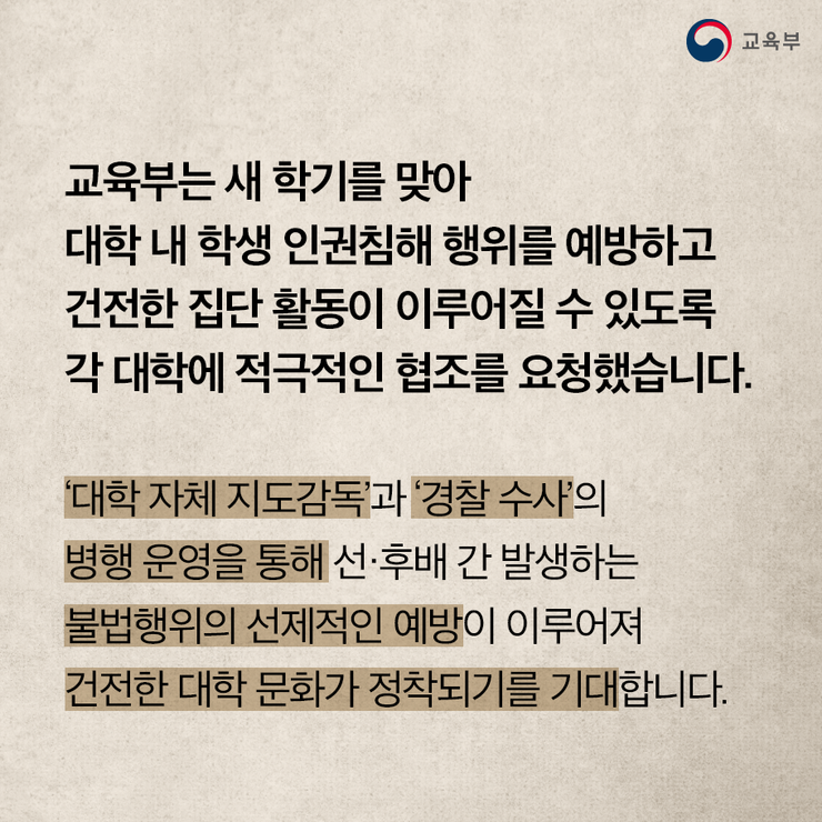 교육부는 새 학기를 맞아 대학 내 학생 인권침해 행위를 예방하고 건전한 집단활동이 이루어질 수 있도록 각 대학에 적극적인 협조를 요청했다고 밝혔습니다.