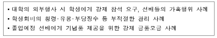 매년 새 학기가 되면 각 대학에서 개최되는 신입생 환영회 및 오리엔테이션 등의 대학생 내·외부 행사를 비롯해 학생회(학과, 동아리) 활동 등과 관련한 학생 인권침해 행위 및 학생회비 등의 민원이 반복적으로 발생해 오고 있습니다