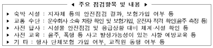 또한 동 기간 동안 10개 대학 이외의 다른 대학의 오리엔테이션에 대해서도 불시점검을 실시할 예정입니다. 주요 점검항목으로는 숙박시설의 안전성, 차량 및 운전자 적격 확인, 음주‧폭행 등에 대한 학생 사전교육 실시, 단체활동 보험가입 여부 등입니다.