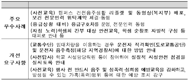 최근 대부분의 신입생 오리엔테이션을 대학본부 주관으로 운영하는 등 학생 안전사고를 예방하기 위한 노력이 확대되고 있으나, 여전히 많은 대학들이 교외에서 대규모 학생행사로 진행하고 있어, 학생 안전사고 예방을 위한 대학의 협력이 요구되고 있습니다.