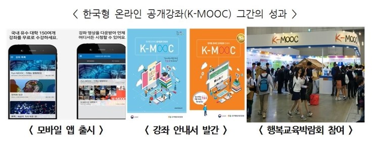 최근에는 K-MOOC 모바일 앱을 보급하여 시간과 장소에 구애되지 않고 학습할 수 있는 모바일 학습 환경을 구축하였으며, K-MOOC 우수사례 공모를 통한 당선작 사례집을 발간하고 행복교육박람회 등 각종 박람회에서 K-MOOC를 소개하는 등 미래교육 플랫폼으로서 긍정적 인식 확산을 위해 노력하고 있습니다.