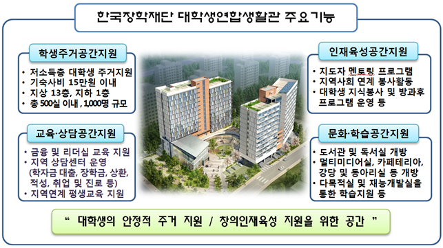 한국장학재단 대학생연합생활관은 교육부와 기획재정부가 협업하여 국유지(약 8,090㎡)를 제공하고, 은행연합회(20개 회원사)의 기부금(326억 원)으로 건립비를 지원하여, 한국장학재단이 건축하고 운영합니다.