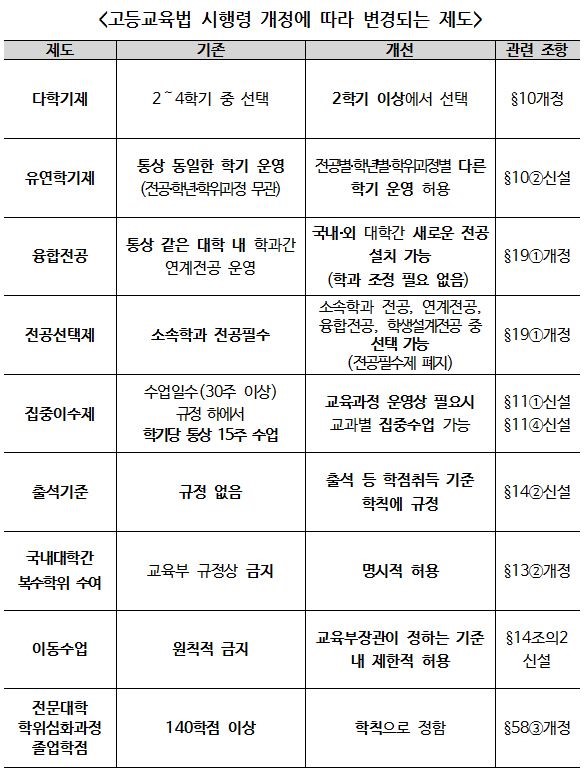 교육부는 4차 산업혁명에 대응하여 대학이 학사제도를 유연하게 운영할 수 있도록 지난 12월 9일 마련한 ‘대학 학사제도 개선방안’의 후속조치로, 융합전공제 도입, 다학기제․집중수업․전공선택제 허용 등을 주요 내용으로 하는「고등교육법 시행령」 일부개정령안이 5월 2일(화) 국무회의에서 통과되었다고 밝혔습니다.