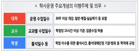 종래 학교별로 학점취득을 위한 출석일수에 관한 규정이 미비하거나 불명확한 점을 보완하기 위해, 학점취득을 위한 최저 출석일수, 출석 대체인정 기준과 범위 등 출석에 관한 사항을 학칙에 명확하게 규정하여 출석관리와 학점 부여가 보다 객관적이고 투명해 질 수 있도록 했습니다.