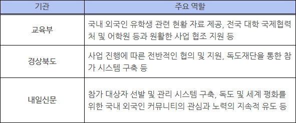 이번 업무협약은 민관협력을 통해 국내 외국인 유학생들에게 독도교육 및 홍보 지원을 강화하여 대한민국 독도를 전 세계 청소년들의 평화 의지를 상징하는 섬으로 만들고자 추진되었는데요. 국내 외국인 유학생 대상 독도교육 및 글로벌 홍보 강화, 국내 외국인 커뮤니티 네트워크 형성 등을 주요 내용으로 담고 있으며 기관별 주요 역할은 다음과 같습니다.